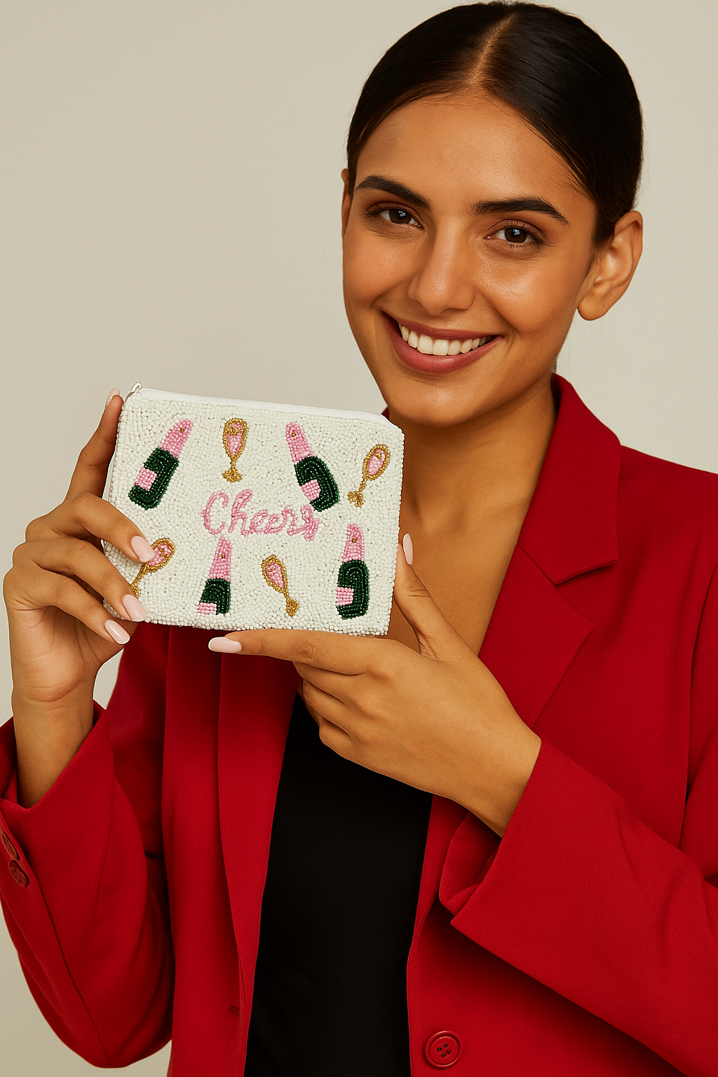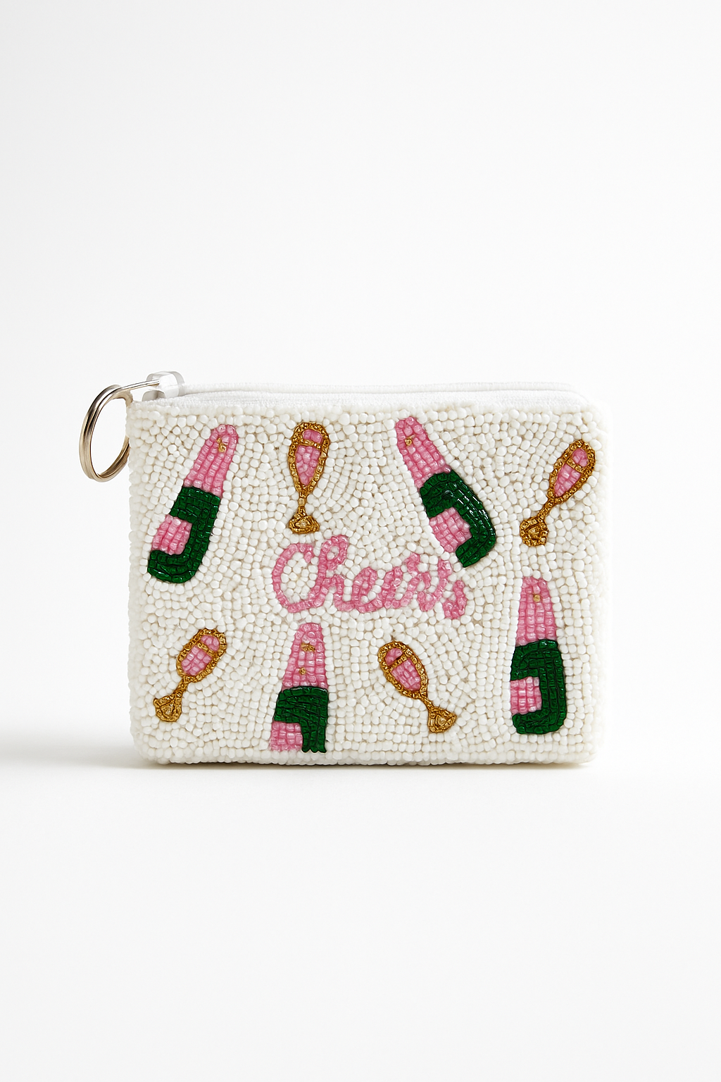 This stylish ‘Cheers’ beaded coin purse is handcrafted with premium beads and features an elegant champagne bottle and glass design in pink, white, and gold tones. With a compact size of 4 inches in height and 5 inches in width, this mini pouch is perfect for carrying coins, cash, cards, keys, and small essentials. Its detailed hand-beaded artwork adds charm, making it ideal for parties, gifting, bridesmaids, and everyday use. A trendy accessory that combines functionality with festive style